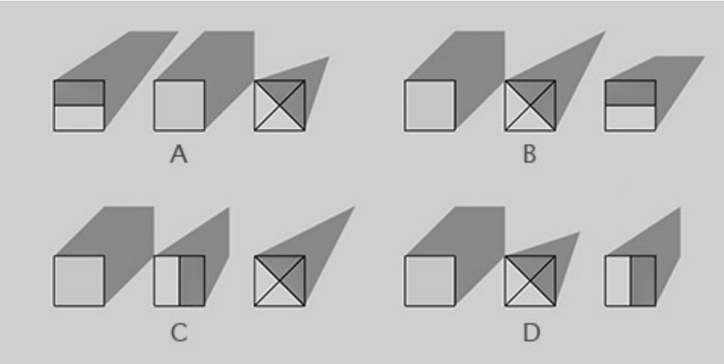 A cube, a triangular prism and a square pyramid of equal height are resting on a surface along a straight line, arranged in a random order. If the source of light is fixed and the light rays are parallel, which of the option shows the shadows correctly in top view?