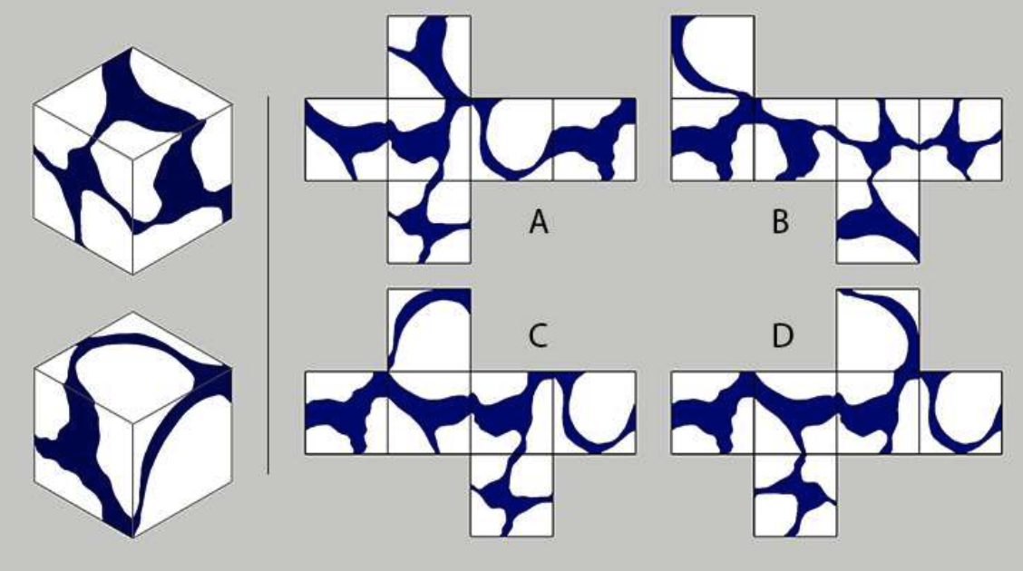 Two views of a cube are shown on the left. Which option represents the unwrapped cube on the left?