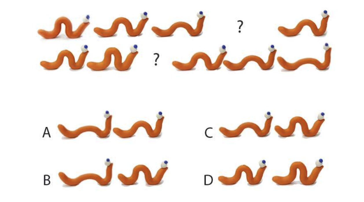 Shown below is the crawling sequence of a worm in eleven frames. Which option represents the missing frames?