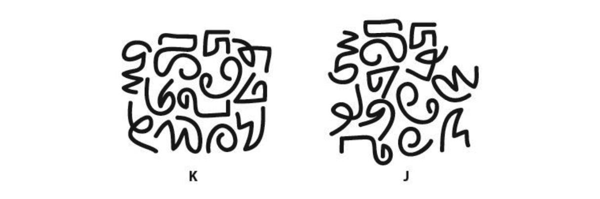 Some of the shapes in the image K are either flipped or rotated in the image J. What is the number of flipped shapes in image J?