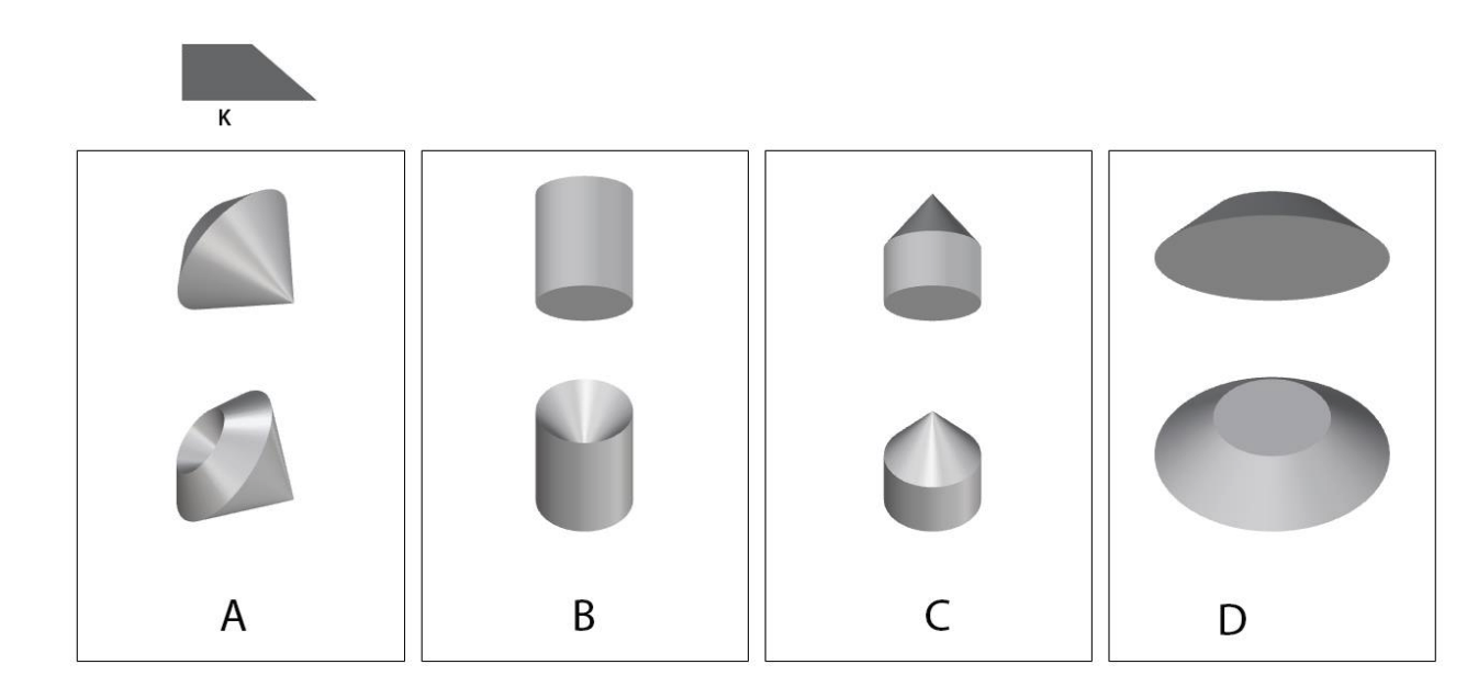 Which of the options can be generated by revolving the quadrilateral in image K, about its edge?