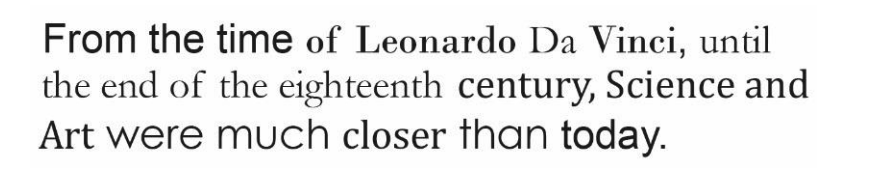 What is the number of fonts used in the following sentence? "From the time of Leonardo Da Vinci, until the end of the eighteenth century, Science and Art were much closer than today."