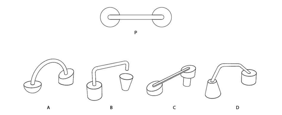 Image P shows an object as seen from the top. Which of the objects given below will appear as shown in image P when viewed from the top? Consider all the objects are made with opaque solids.