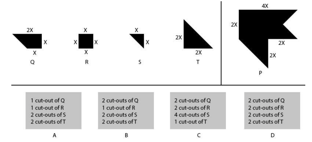 Q, R, S and T are cut-out shapes used to create a composition shown in image P. These cut-out shapes could be rotated and combined without overlapping to create the composition. These cut-out shapes can also be repeated. What is/are the correct combination(s) that can be used to create the composition shown in image P?