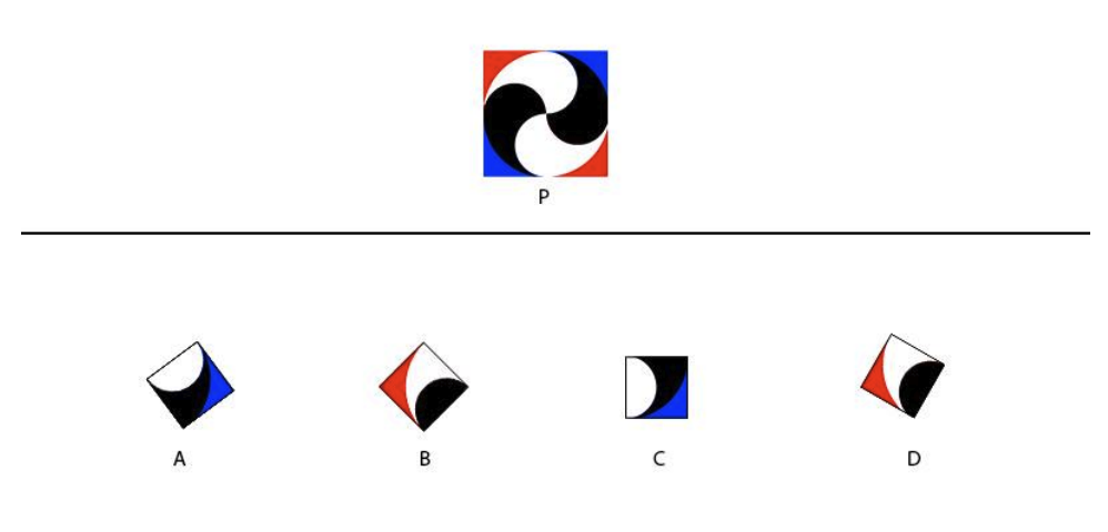 P is a completed puzzle made of four-square pieces. If the four pieces are removed to play the puzzle again, which piece shown below will NOT fit into the final image?