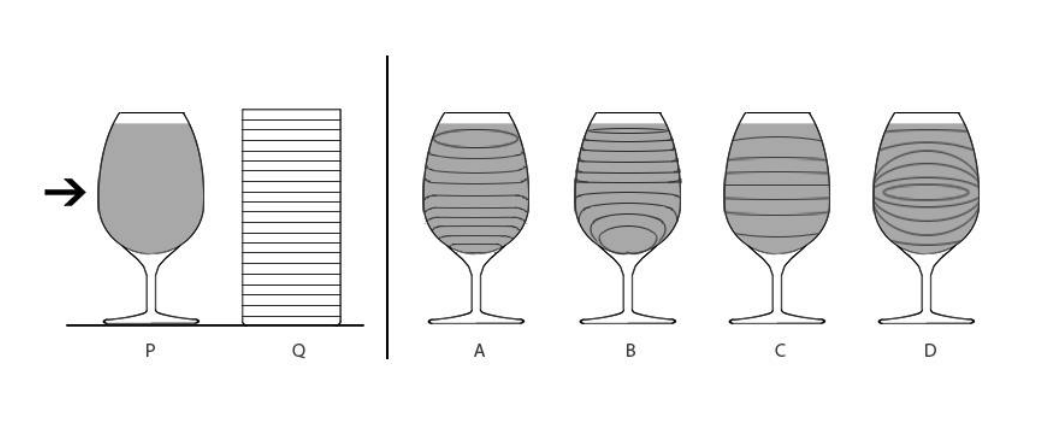 P is a transparent glass filled with water as shown below. Q is a white cylinder with parallel lines printed around it. If the cylinder is viewed through the glass from the direction of the arrow, find the correct pattern observed.